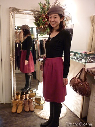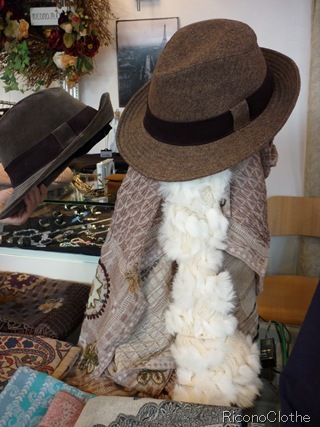本日のコーディネイト 中折れ帽・・・RiconoClotheオリジナル(¥8,925) ストール・・・フランスインポート ファー・・・ラビットファーストール スカート・・・ウールタックフレア(¥10,290) ブーツ・・・本革ブーツ(¥19,950) 2009年10月11日