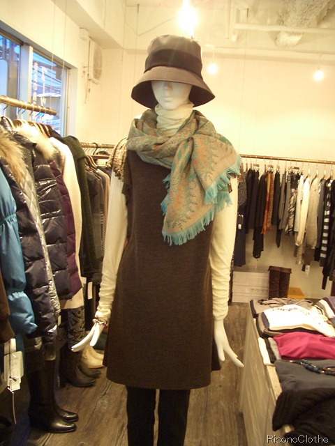 茶系のコーディネイトにミントグリーン系のストールで柔らかいアクセントをつけてみました。