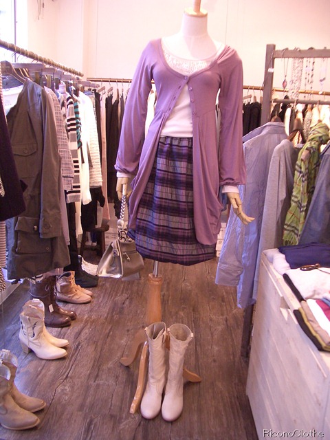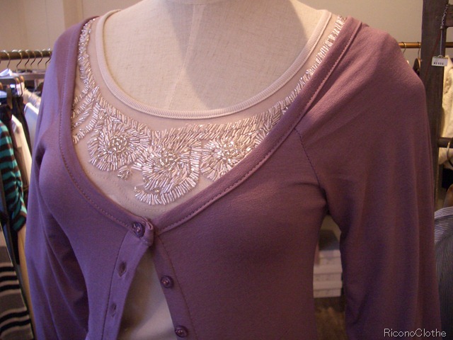 そこで、本日はラベンダーピンクのカーディガンにパープルの入ったチェックのスカートと、綺麗なビーズのカットソーで合わせました。