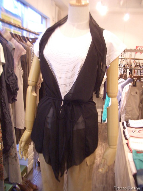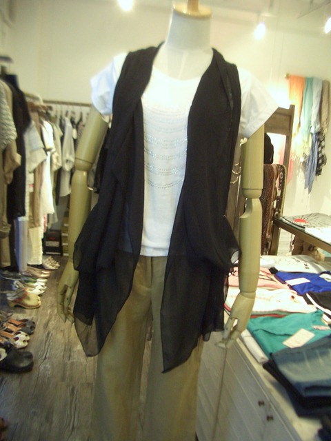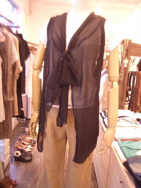 大人気シフォンジレ再入荷しました!! カットソーとシフォンの生地を組み合わせたこちらのジレは軽く羽織ったり、前で結んだり、数通りの着こなしが楽しめる一枚です。 お色はお写真のブラックとグレーの2色。 着心地も柔らかく、デザイン性の高さはピカ一です!! 一年中活躍しますよ~♪ ジレ ¥ 7,875 2010年7月26日