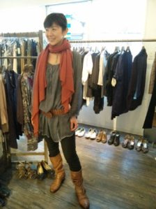 お写真は 麻の白いロングジレとレンガ色のコットンストールでコーディネートしてみました。