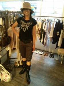 そんな訳で本日のコーディネートは スタッズがおしゃれなカットソーに 旬なサルエルパンツを合わせてみました。夏物だけど、足元にブーツを合わせたら、グッと秋のスタイルに見えますよ。
