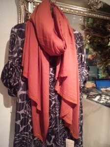 春から大人気のストール達… 巻いたり羽織ったりとストール一つで 着こなしをぐっとおしゃれに見せてくれる優秀アイテム。秋はリコノ企画で出来上がって参りました。薄く柔らかいコットン素材で、縁に細かく縫い込んだビーズがとってもおしゃれな一品です♪ メーカーは早くも完売の為、ご興味のあるお客様はぜひお早めに見にいらしてくださいね。お色は、レンガ、チャコールグレー、ベージュ、パープルの4色で価格は5145円です。