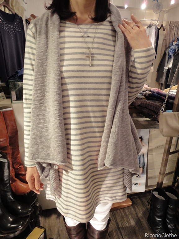ボーダーコットンチュニック&ニットジレ♪ これまた 可愛いコットンチュニックが入荷しました。 ソフトなコットン素材で肌触りは抜群!! 優しいグレーが大人っぽくて、何ともおしゃれな一枚。 同色のジレで、上品なマリンテイストの出来上がり。 アウターに濃い色が来るこの季節。明るい色目のインナーは必需品ですよん。 ボーダーチュニック ¥ 6,195 ニットジレ ¥ 7,245 2010年11月15日