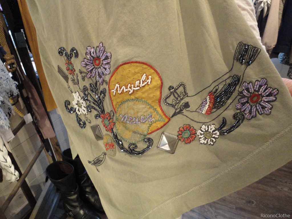 シンプルに黒カットソーで着ても良し。モティーフが素敵なインポートのカットソーで着ても良し。