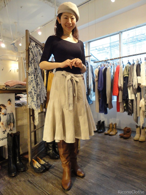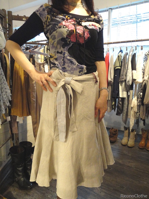 リネンとレーヨンのミックス生地なので、トロン、、とした落ち感も 腰周りをすっきり華奢に見せてくれ、膝が隠れる着丈も嬉しい!!