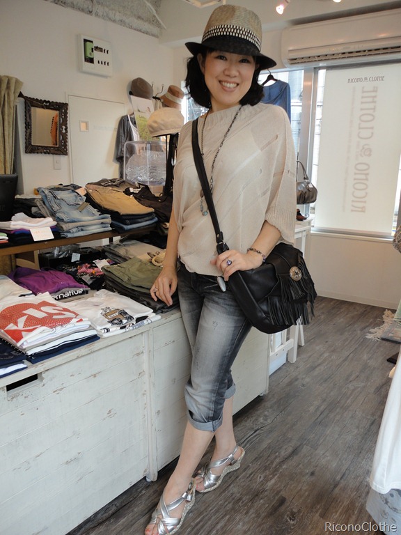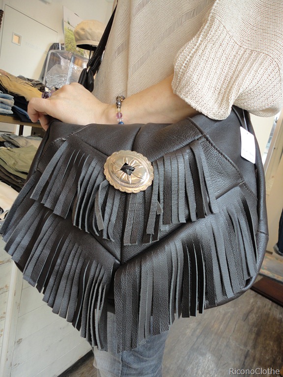 斜め掛けにしているバックはUSAからのインポート、乗用車の本革シートのリサイクルと