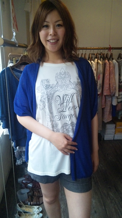 29 July, 2011 01:42 秋の新作カーディガン ロイヤルブルーのカラーが素敵な カーディガンが入荷しました。 まだまだ暑い毎日ですが 秋はもうすぐそこに来てます。 シックなカラーを 一足先にゲットして 晩夏をクールに着こなしちゃいましょ♪ ボレロ風のお袖でワキ汗も気にならず、サラサラの着心地。 お色は他に 定番のブラックと おしゃれなグレージュの三色です カーディガン 11、550円 国内メーカーによる上質なニットですよん♪ 2011年7月29日