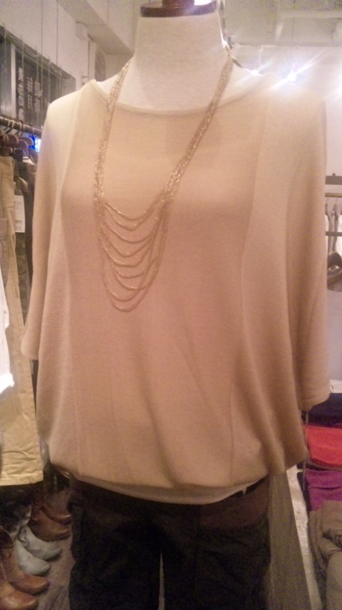 1 August, 2011 23:36 オススメ新作ニット 入荷しましたぁ いつも大人気の上質ニットメーカーから新作のドルマンニットが入荷致しました♪ その着心地はしっとりとした感触で 着た瞬間に、ラグジュアリーな気分にさせてくれます… いつものデニムだって、良い女風な感じに早変わり♪ お袖は5分袖で二の腕もすっきりカバーと言うこと無し。 これからの晩夏にはマストアイテムですよん。 お色は ブラックとお写真のティーベージュの二色です ニット 12、600円 追伸 明日は新しい新作のパンツも入荷致します。 お楽しみに〜♪ 2011年8月1日