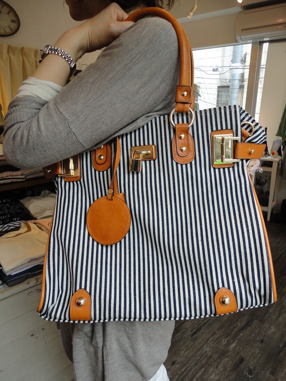 アクセントにネイビーストライプのトートバックを斜め掛けしてみました。