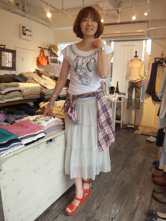 さて 本日は白いスカートに白いTシャツの着こなしを ぐぐっとお洒落に見せてしまう