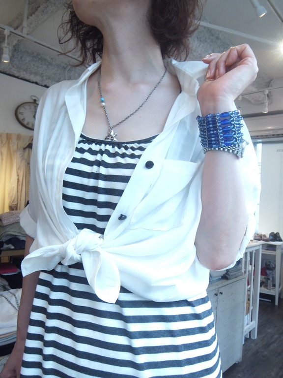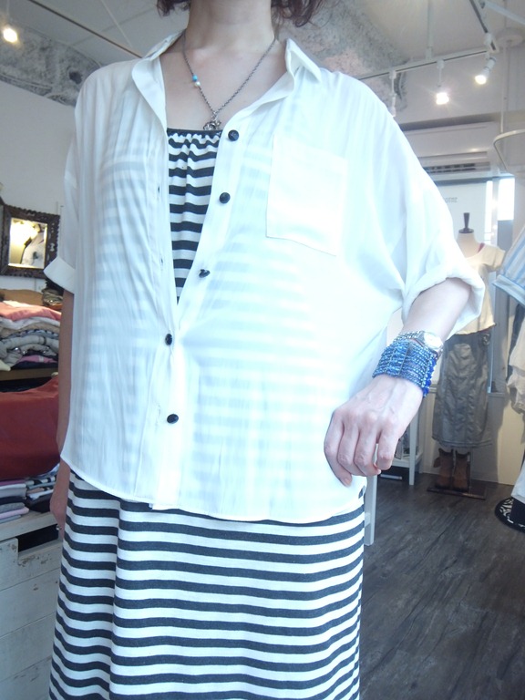 とろみブラウスコーディネート♪ むしむしと段々に夏に近づいて来た気がします。。この時期、マキシワンピなど 着ると涼しいアイテムは必須。でもまだ肩を出すには早いような、、、そんな時 ゆったりとろみブラウスがとっても役に立ちます! マキシワンピの上に着て、前の部分を結ぶとこなれた感が出てとっても素敵です♪ さらりとさりげなく着てもオシャレですよ~! マキシワンピ ¥6,615 とろみブラウス ¥12,600 2012年7月5日