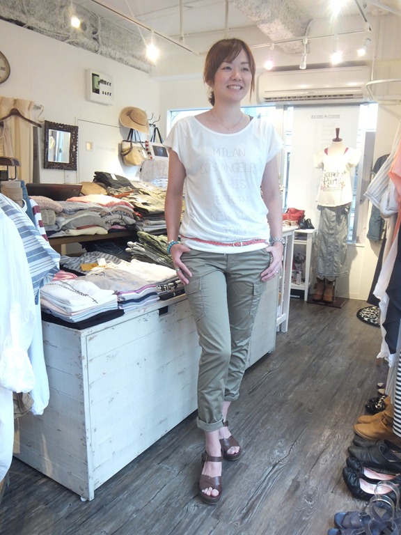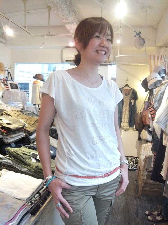 ラインストーンTシャツ再入荷♪ 大好評頂いておりましたTシャツが再入荷しましたよ~! 二の腕も隠れてスッキリ見えるフェミニンTシャツです。胸元のラインストーン がさりげなくてとってもオシャレです! お色は白とブラックとライトグレーの3色です。 ぜひぜひお早めに~。 Tシャツ ¥5,145 カーゴパンツ ¥11,550 ピンク細ベルト ¥3,045 2012年7月6日