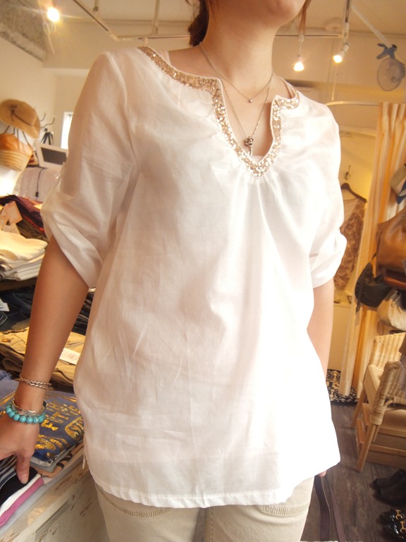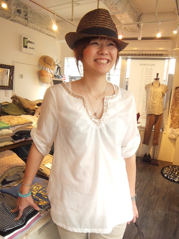 爽やかブラウスコーディネート♪ 透け感のある爽やかなブラウスとベージュのパンツのご紹介です。 首元にスパンコールの付いたブラウスは袖が7分から5分袖にロールアップ出来て とっても便利。 キーネックに開いた襟元で 小顔効果もバッチリ~ 薄い綿ローンの素材感で涼しく、日焼けも防いでくれる 夏に万能なブラウスは 何枚あっても良いですよね~ インナーの薄いピンクのタンクトップもお奨めで~すっ。 ブラウス ¥6540 タンクトップ ¥4410 帽子 ¥ 3、675 トートバック ¥12,600 2012年7月12日