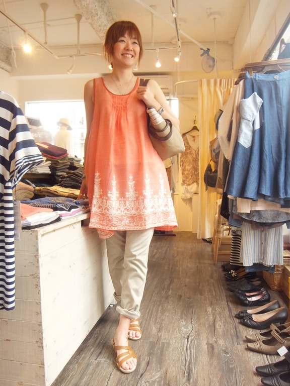 オレンジのワンピースは夏らしい色使いと裾の刺繍が女性らしく、夏気分を盛り上げて