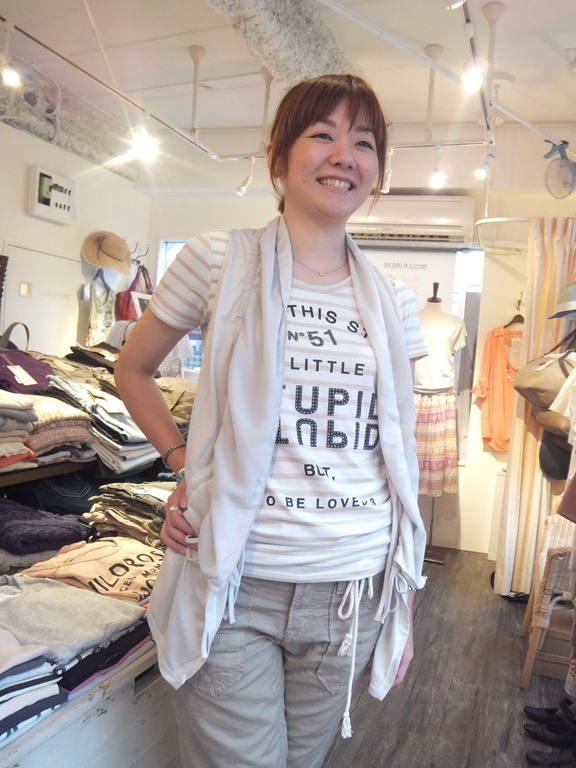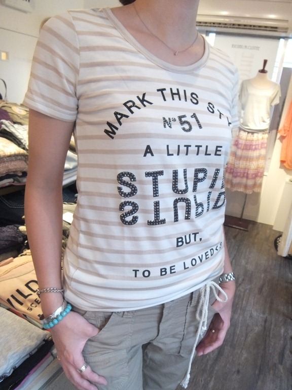ボーダーTシャツ入荷しました♪ スッキリしたシルエットでとっても着心地の良いボーダーTシャツのご紹介です! プリントにラインストーンが付いていてカジュアルなボーダーTもキラッとオシャレに 変身!! 重ねてジレを着るとさらにオシャレ感アップです♪ お色違いでグレーもございますよ~。 ボーダーTシャツ ¥6,195 ジレ ¥7,245 2012年7月18日