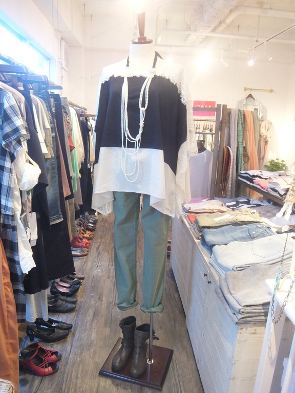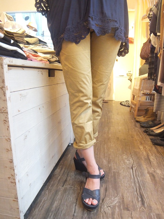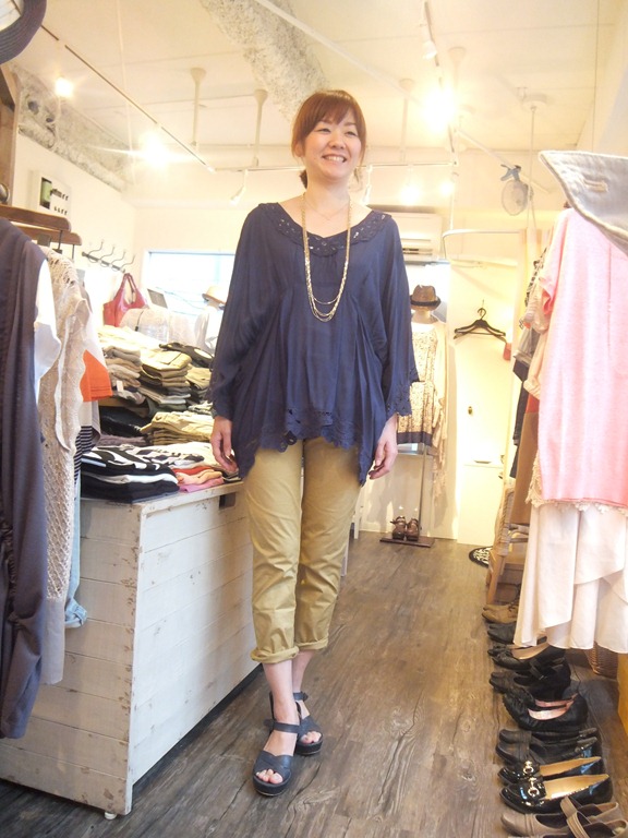 カラーパンツコーディネート♪ 今年流行のカラーパンツのご紹介です! 晩夏から初秋にかけて、ダークな色使いになって行きますが、カラーパンツはきれいに アクセントカラーになってくれます!! 今回は、ネイビーとマスタードカラーのカラーパンツの色あわせ♪サンダルとトップスをネイビーで 合わせることによってカラーパンツが浮かず、まとまりますよ~! ぜひ、お試し下さい~♪ レースブラウス ¥9,345 カラーパンツ ¥10,395 2012年8月23日