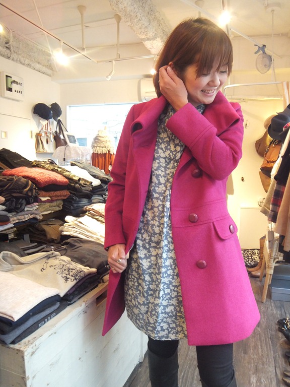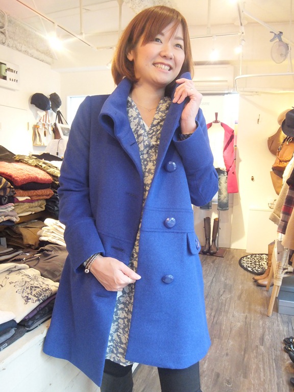 きれい色コートのコーディネート♪ とってもきれいなロイヤルブルーとピンクのコートが入荷してきました~!! 昨年から大人気のウールコートのデザインにかなりキレイな色が今年っぽい♪ ダークな色になりがちな冬の時期、着るだけで気持ちが踊る素敵な 2色です。 どっちの色にするか迷っちゃいそう♪ きれいな色のコートが登場するのは今の時期だけですよ~!ぜひぜひお早めに!! コート ¥37,800 2012年10月14日