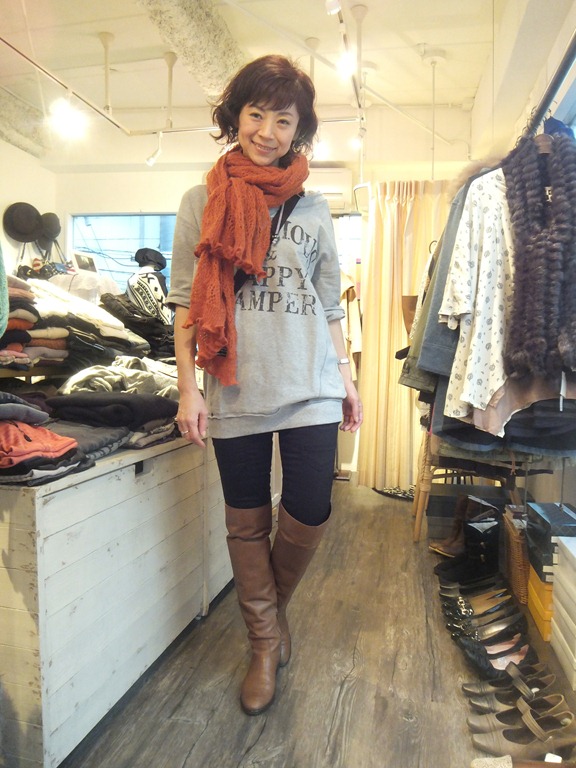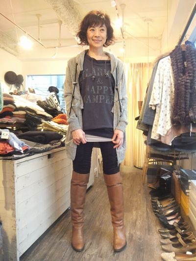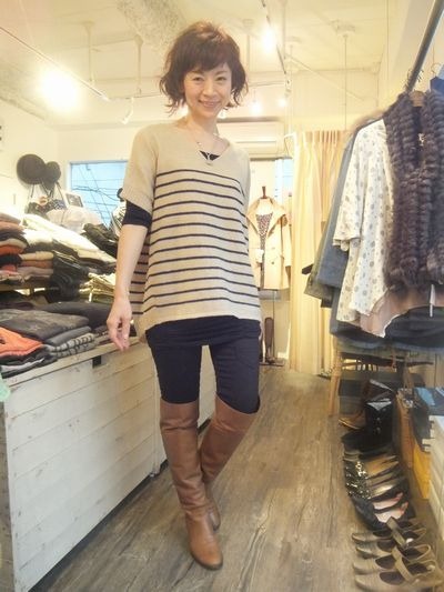 ブラックスキニーのコーディネイト♪ 足、、、、 細く 見せた~いっ!! そんな 貴女にお奨めは やっぱり ブラックスキニーです。 何たって やっぱり 細く見えるんですからっ!! 足元は ミドル ロング ニーハイと 何でもござれ。 トップスには 比較的大きめのシルエットで 更に足細を狙います。 皆さんも ぜひ試してみて下さいね~ ボーダーニット ¥ 4,095 英字カットソー ¥8,295 ロングブルゾン ¥12,390 イタリーインポートストール ¥ 9,345 ブラックスキニーパンツ ¥ 13,650 2012年11月12日