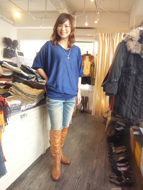 フューシャピンクのコート & Vネックシンプルニット 軽くて柔らかなウール素材のスタイリッシュなコートは今期も大人気です。 完売していたフューシャピンクが再入荷致しましたぁ~ 来月はいよいよクリスマス♪ こんな綺麗なコートを着て女子力アップ!!してみてはいかがでしょうか? キャメルのニーハイブーツも入荷しました。 気になる方はお早めに~ ウールコート ¥ 37,800 Vネックニット ¥ 13,650 牛革ニーハイ ¥19,950 2012年11月16日
