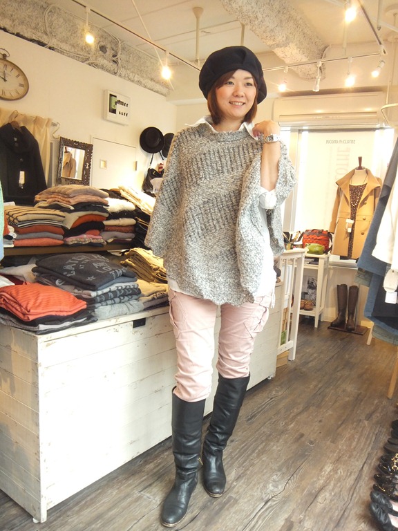 1枚目は 変わり糸のブークレ素材のニットポンチョです