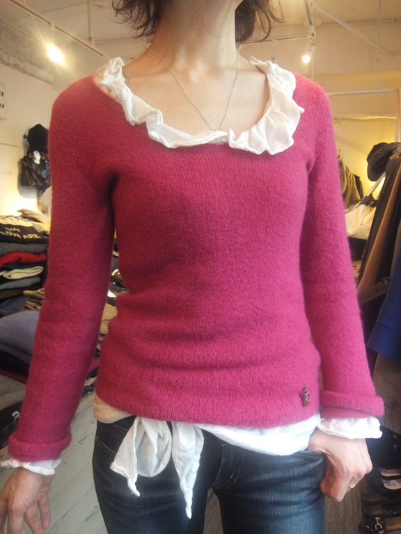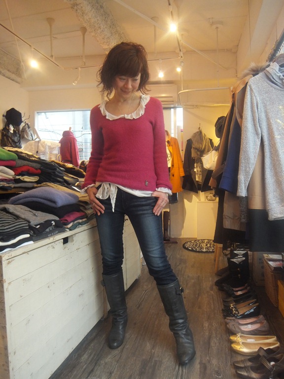 イタリーインポートニット オペラピンク♪ キレイな発色と 暖かさ 着痩せ効果の3拍子で 引き続き大人気のシンプルニット。 今回は オペラピンクが再入荷 ♪ 春先取りの 新鮮なカラーが 冬の着こなしに華を添えます、 、、 インのブラウスは 夏に大人気だったコットンシルクのブラウスで合わせてみました。 いつものデニムだって パリジェンヌみたいなフェミニンスタイルに早変わり~ 皆様もぜひ お試し下さいね~ ニット ¥ 9,975 デニム ¥9,345 2012年12月24日