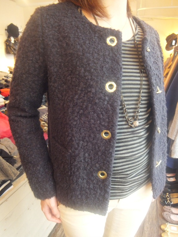 ブークレージャケット♪ ブークレーの素敵なジャケットのご紹介です! お正月のお出かけなどに、スッキリと着れてあったかなブークレージャケット♪ デザイン性のある金具がとっても上品で個性的に見えます。 白コーデュロイとのコーディネートも素敵~。 お色はネイビーとキャメルの2色です♪ 気になる方はお早めに~!! ブークレージャケット ¥15,750 コーデュロイパンツ ¥12,600 2012年12月25日