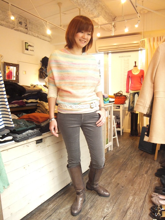 春カラーの新作ニットのコーディネイト!! キャンディカラーのフワフワニットが入荷しました。 柔らかいニュアンスカラーのニットなので 足元はグレイッシュなコーディユロイパンツと オリーブカラーのブーツで 大人っぽくコーディネイトしてみました。 もう、来月は 新春 ♪ 新年はルンルンの春カラーで迎えてみてはいかがでしょうか? ニット ¥ 13,650 パンツ ¥ 12,600 イタリア輸入 ブーツ ¥31,500 2012年12月15日