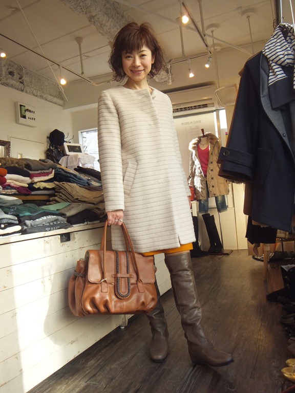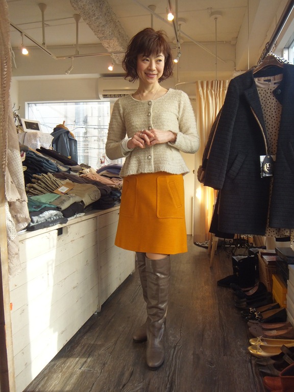 アプリコットカラーのスカートとぺプラムニット♪ 気分まで明るくなるような ビタミンカラーのスカートが入荷しました!! キレイな台形の形は スタンダードですが ポケットのデザインが効いていて とってもおしゃれ♪ 素材は ポンチ素材で すっきりしていますが かなり暖かいです。 展開カラーは お写真のアプリコットオレンジ、 ミルクベージュ、ブラックの3色 おサイズも Sサイズから Lサイズまでございます。 忘年会や 新年会にも素敵ですよ~~ スカート ¥ 11,550 コート ¥ 34,650 ニットカーディガン ¥ 13,650 2012年12月18日