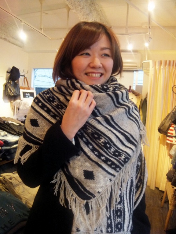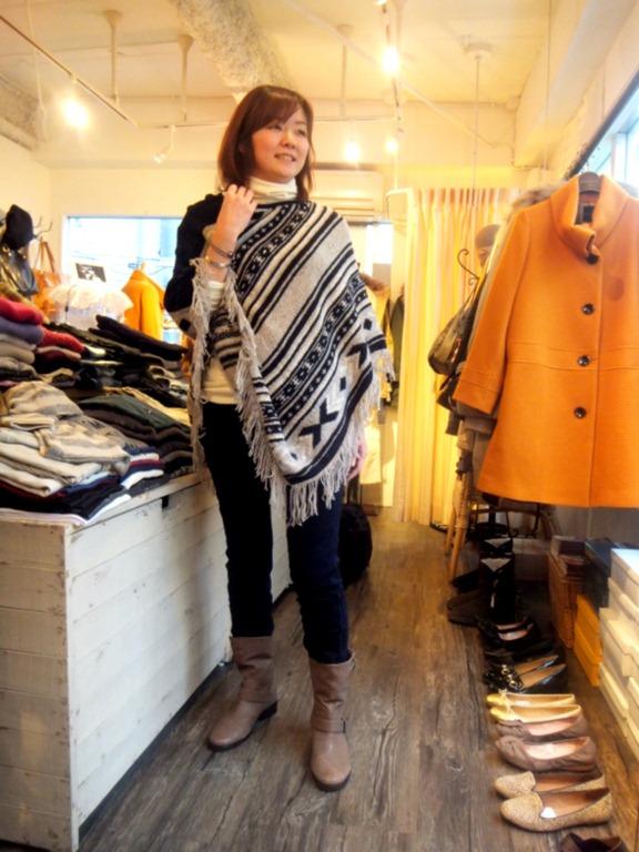 エスニック柄のニットポンチョ。可愛いけれど、コートが着れないから、