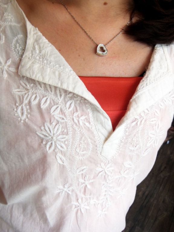 刺繍ブラウスの襟開きから覗くオレンジの綺麗な色がとっても素敵!