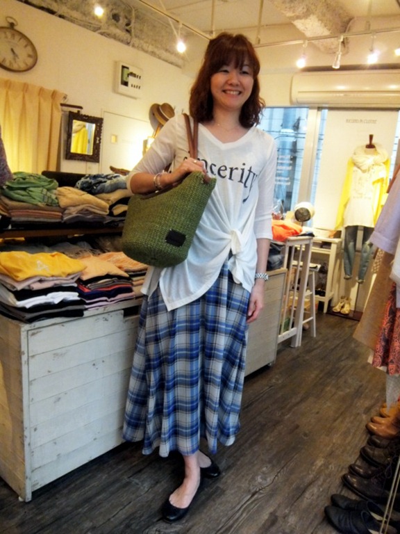 マキシ丈チェックワンピース♪ 爽やかなブルーのマキシ丈ワンピースが入荷しました!! なかなか珍しいチェック柄のマキシ。トップスにさらりとした Tシャツを着ると素敵♪ カゴバッグで春夏仕様に。 なかなか出ないチェック柄のマキシなのでお早めに~♪ Tシャツ ¥2,940 ワンピース ¥9,345 カゴバッグ ¥11,550 2013年4月4日