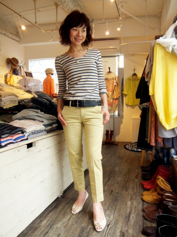 春のお奨めパンツ♪ 爽やかな春パンツ入荷しました~!! ちょっと他とは違う春パンツをゲットしましょう♪ 履き心地が良くて、スッキリ見えるパンツは必須です。 デニムの色落ちも絶妙ですよ~。 お早めに~♪ ボーダーTシャツ ¥4,935 パンツ(イエロー) ¥11,550 ブラウス ¥15,750 デニム ¥17640 2013年4月10日