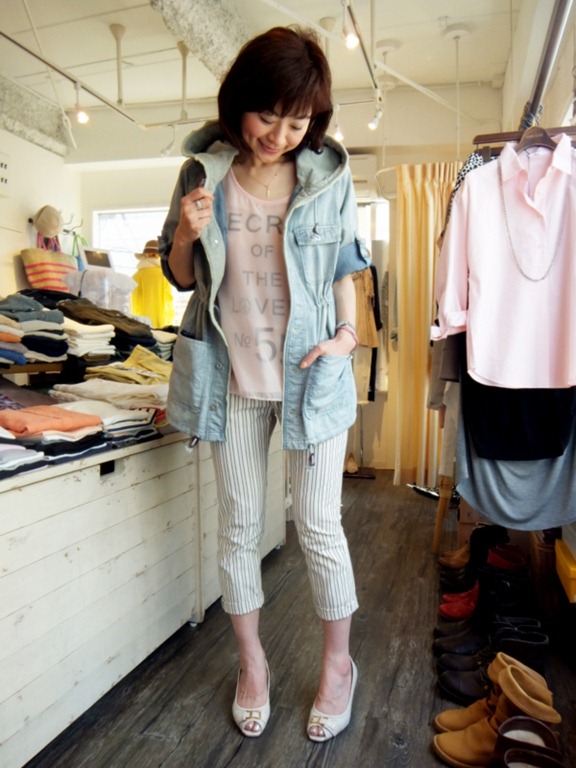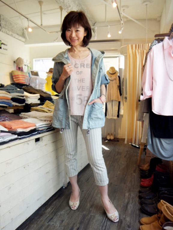 デニムジャケットとストライプパンツ♪ やっと暖かくなってきましたが、朝晩冷えたり今の時期は薄めの羽織は 必需品!! デニムのサラッとした羽織が役立ちそう♪ストライプパンツで爽やかに。 梅雨寒の時期にもちょうど良い羽織ですよん。 デニムジャケット ¥14,490 ストライプパンツ ¥13,650 Tシャツ ¥7,245 2013年5月11日