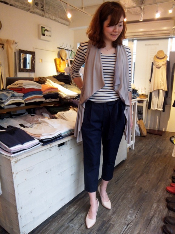 綺麗めテーパードパンツ♪ ウエストにリボンが付いている綺麗めテーパードパンツのご紹介です。 少しゆったりとしたシルエットなのにスッキリ見える優れもの。 良く見かけるスキニーやゆるパンに飽きた方~!かなりお奨めですよ。 通勤にも使えそう♪ お色はネイビーとキャメルの2色です。 テーパードパンツ ¥10,290 2013年5月12日