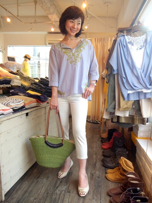 ラベンダーカラーの刺繍ブラウス♪ 上質なレーヨン100%の女っぽいブラウスはいかがでしょうか? 白パンツに合わせて 爽やか過ぎるカラーは眩しすぎて ちと 照れてしまう、、、、、 そんな大人の女性にピッタリな ラベンダーカラー♪ ラベンダーにモスグリーンの繊細な刺繍がなんともおしゃれ!! 洗ったままで 皺にならないのも、忙しい貴女にぴったり 美脚白パンツも残り僅か、、、、 むっちり見えない白パンなんて、、、、希少です 刺繍ブラウス ¥12,600 白パンツ ¥6,300 かご 本革使用 ¥11,550 2013年5月12日