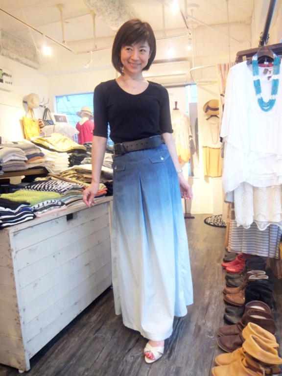コットンマキシ丈スカートのコーディネイト 真夏に大活躍のコットンスカート!! ウェスト周りに濃い目のカラーがきているので、引き締まり効果抜群で、めちゃ細く見えるんです。 大人っぽく黒のカットソーで、、、、爽やかな感じに白いブラウスで、、、、 着こなしの幅も大きい。 マキシ丈スカート数あれど、、、、、こんなデザインは見たことがありません。 痩せた??? と聞かれそうな そんな素敵なスカートですよん 黒いカットソー ¥5,775 スカート ¥8,820 2013年6月24日