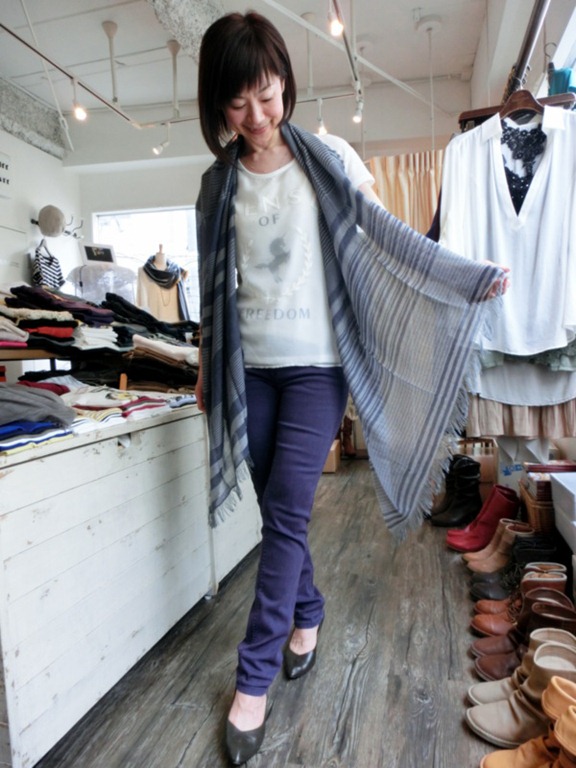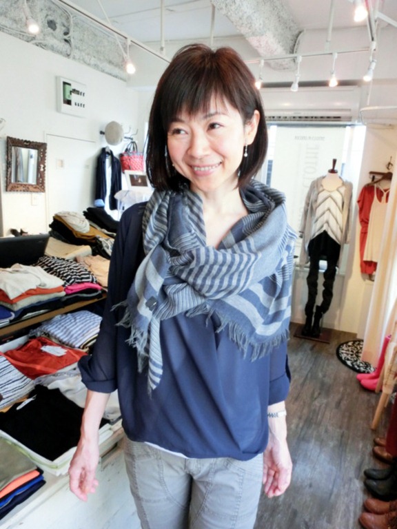 首元にブルー×グレーのストールを巻くとグレードアップしますよ~!