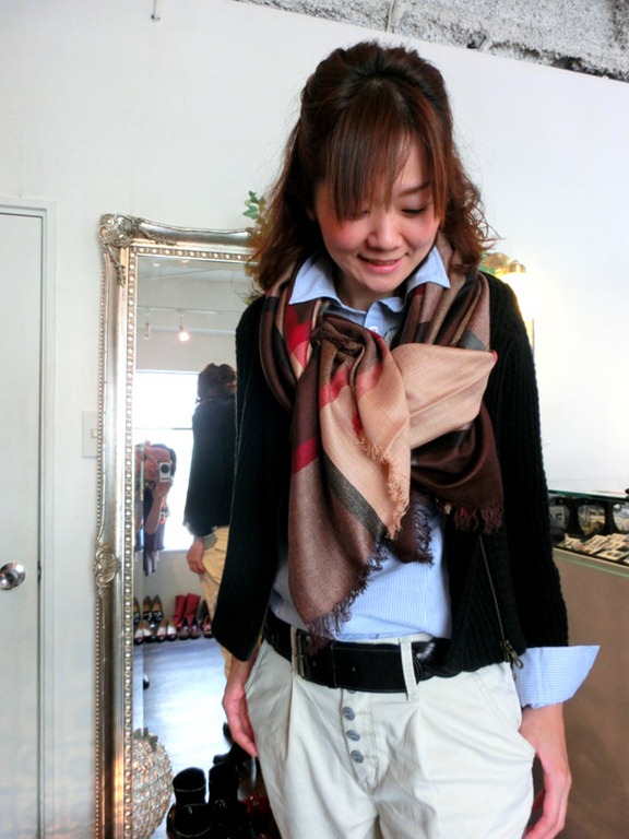 チェックストールとストライプシャツ♪ 今年流行のチェックモチーフ♪ 茶系にワインカラーのポイントがおしゃれなストールが入荷しました!! サックスブルーのストライプシャツで ワンランク上の色あわせでコーディネイトしてみました。 水色に茶系はとてもおしゃれな組み合わせです 黒いブーツと黒いニットライダースジャケットで引き締めて。 ニットジャケット ¥14,700 ストール ¥6,195 シャツ ¥6,195 ブーツ ¥16,590 2013年9月29日