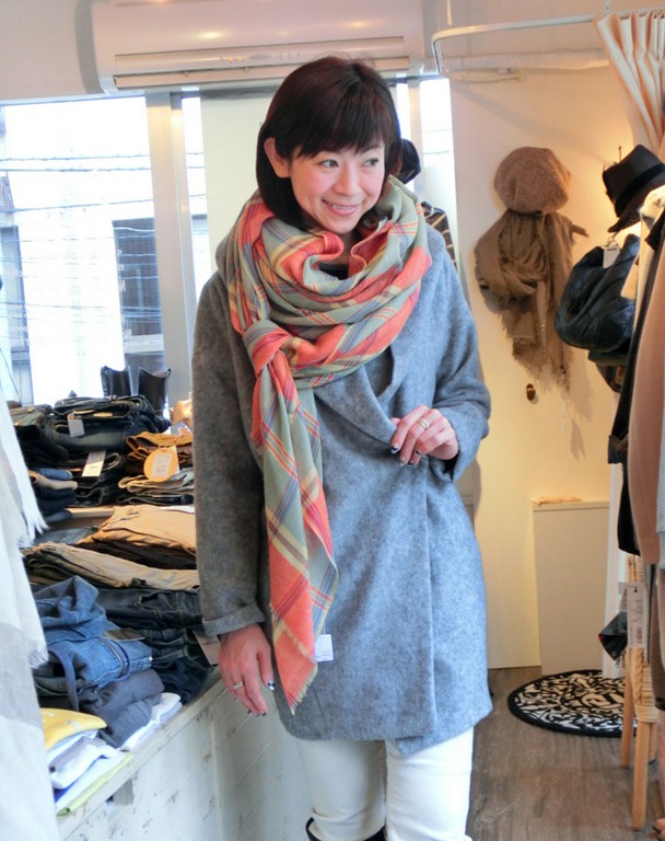 薄めのストールもまだまだ活用できます♪秋色や秋素材ストールと組み合わせる