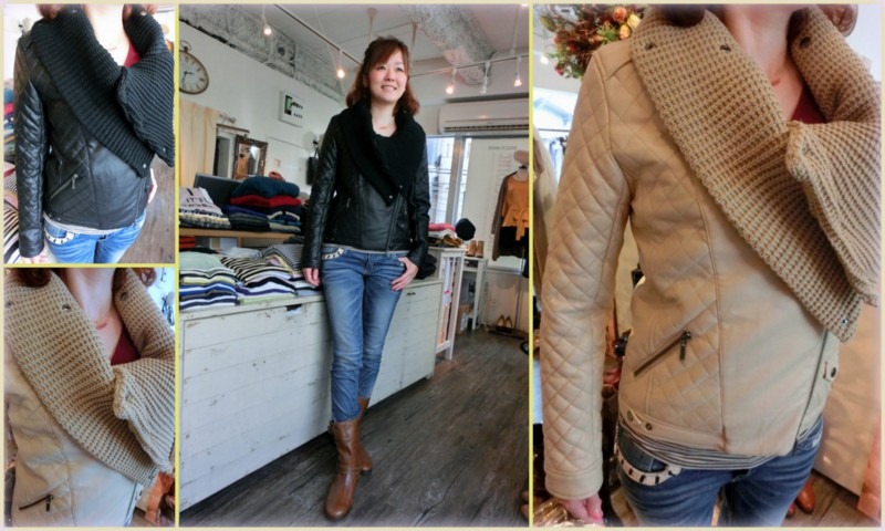 ライダースジャケット入荷しました~♪ 柔らかくて軽いライダースジャケットが入荷して来ました♪ 首元が大きめのニット素材で出来た襟になっていて、ライダースなのに 硬い感じがしないフェミニンジャケット。 お色はブラックとベージュの2色です! 着心地も良く風を通しにくいので秋冬に活躍しそう♪ ライダースジャケット ¥20,790 2013年10月8日