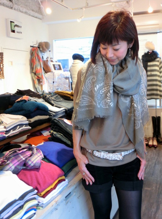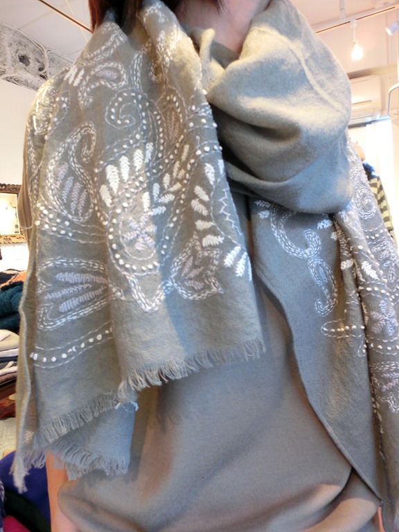 インドの手刺繍ストールとウールカットソー♪ 手刺繍の素敵なストールとシンプルプルオーバーのコーディネイトです シックなカラーのカーキベージュに黒、、、、、 ちょっとありがちな組み合わせに清涼感を与えるのは やはり 白ベルト!! 刺繍の白とベルトの白がリンクして シックなのに華やかなコーディネイトになりました。 この技、、、、かなり上級ですよん。 手刺繍ストール ¥9,450 本革ベルト ¥5,145 後ろジッププルオーバー ¥14,700 2013年11月6日