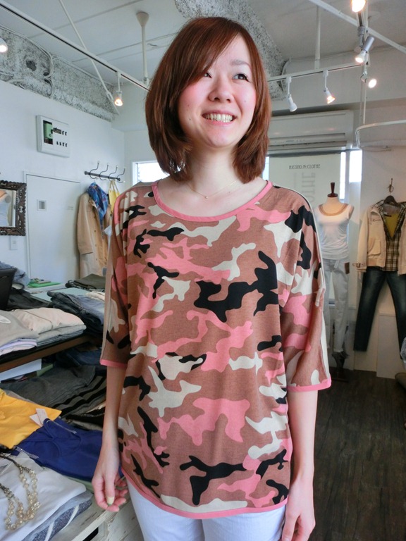2WAY迷彩7分カットソー 今期人気の迷彩プリント。 でもちょっと手が出ない、、、、、 だって 私にはハードすぎる、、、、、 そんな貴女に こんなフェミニンなピンクの迷彩はいかがでしょうか? さらに なんと~~前後どちらも着られるので 迷彩に飽きたらシンプルにも使えるんです、、、、、 これは嬉しい昨日ですぞ!!! おしゃれでクールな迷彩でカジュアル上級者を目指してみて~ カットソー ¥6,825 デザインカーディガン ¥13,440 2014年3月8日