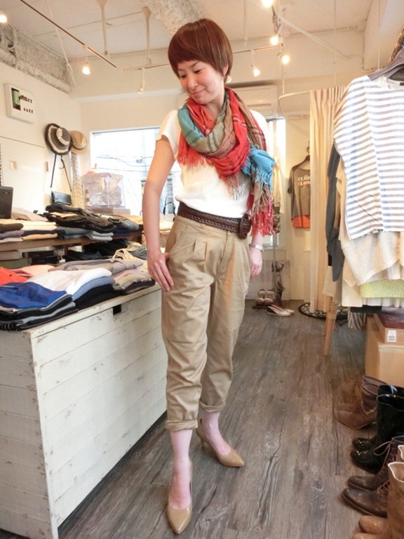 ハイウェストパンツのコーディネート♪ 今年新鮮なパンツは断然ハイウェストパンツ♪ 足長効果バッチリです!!靴もパンツ色で繋げるとよりスッキリ見えますよ~ トップスをウェストにインしたら濃い目のベルトでマークするのがポイント♪ もちろん履き心地もバッチリ。 スキニーパンツに飽きてきた方、ぜひお試しあれ~! 2014年5月4日