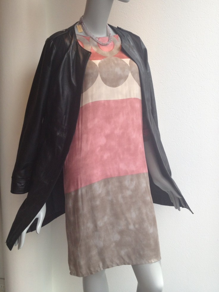 インポートワンピースとラムレザーコート 大きめのドットがおしゃれなデザインワンピース 5分袖なので、蒸し暑くても、着心地抜群です! オレンジ系もございますよぉーっ リコノクローシェ 山崎範子〓 2014年10月3日