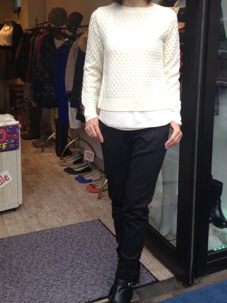 鹿の子編みデザインニットとストライプパンツ 裾にシフォン切り替えのデザインニットが大人気です 冬の白はノーブルで上品な雰囲気。 新年に向けて、爽やかにスタート出来そうですねーっ 他にはペールブルーもございます。 ストレッチのパンツ、ウェストがゴムで、抜群の履きやすさ。 ピンストの生地感で、キチンとした表情なので、オフィスにもバッチリです どちらも特別価格で販売中でーす リコノクローシェ 山崎範子〓 2014年12月21日