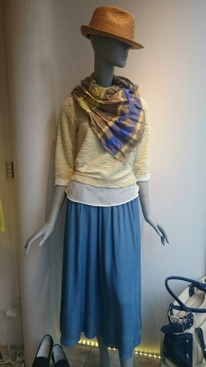 ロイヤルブルーのロングスカート♡5900円 発色の綺麗なロイヤルブルーのスカートとかも裾にシフォンのついた重ね着風のデザイントップスのコーディネート。 イエローとブルーのコンビネーションがとても爽やか〜 トップス 6900円 2015年3月9日