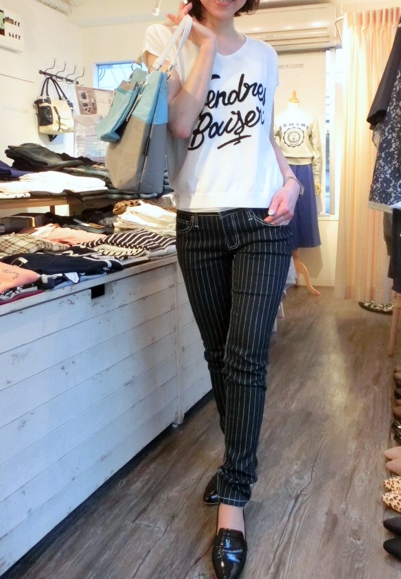 インレッド掲載のストライプパンツ こちらが履きやすさとカッコ良さで、抜群の人気のパンツです! 英字のデザインニットは、今季一番の使えるアイテムです 腕が細っそり見えるーっ それだけでもう、買い‼️ですよん ニット 9800円 パンツ 11800円 シューズ 8900円 バック 3900円 ポーチ付き 2015年3月10日