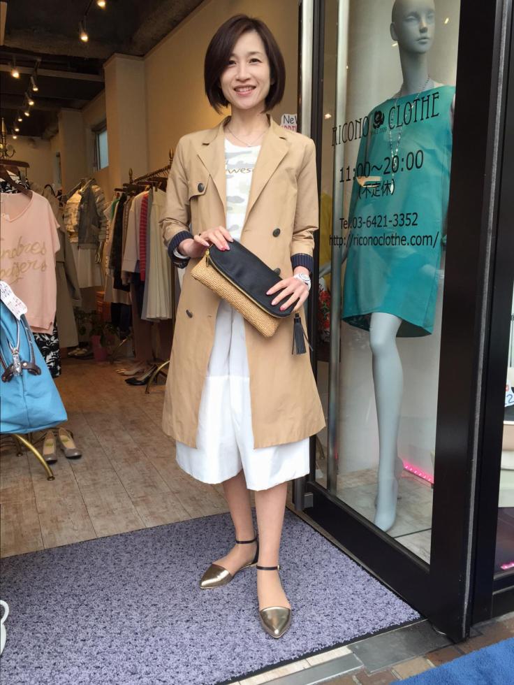 ガウチョパンツとトレンチコート 白のガウチョパンツとベージュのトレンチコートで、上品でスタイリッシュなりコーディネートにさせて頂きました! 袖口の折り返しのストライプやバックの黒がポイントになって、全体を引き締めてくれてます。 迷彩のカットソーやゴールドのサンダルもポイント♡ コート 19800円 ガウチョパンツ 19000円 バック 7500円 本革サンダル 6400円 山崎範子 2015年3月21日