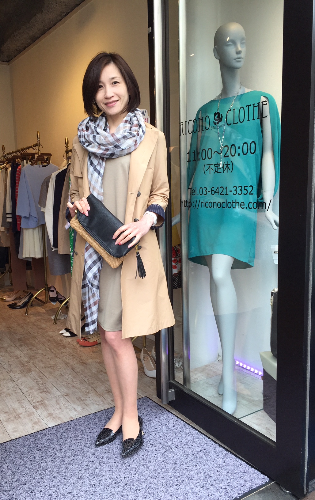 アースカラーのワンピースとトレンチコート 7分のお袖が嬉しいアースカラーのワンピースは、クロコの型押しのパンプス、シックな茶系のリネンのストールでコーディネートさせて頂きました。 茶系アースカラーの着こなしは、とても都会的な感じですよぉ〜 山崎範子 2015年3月21日